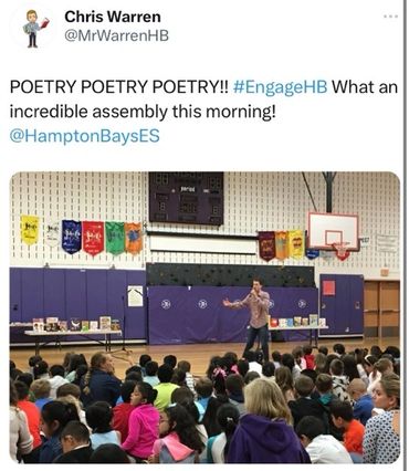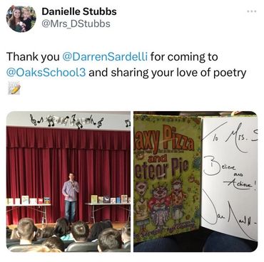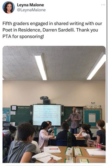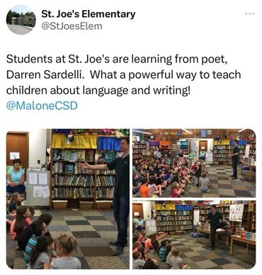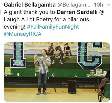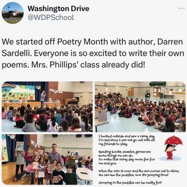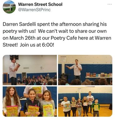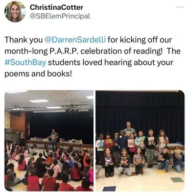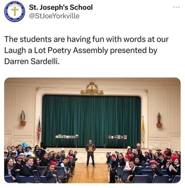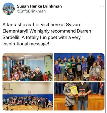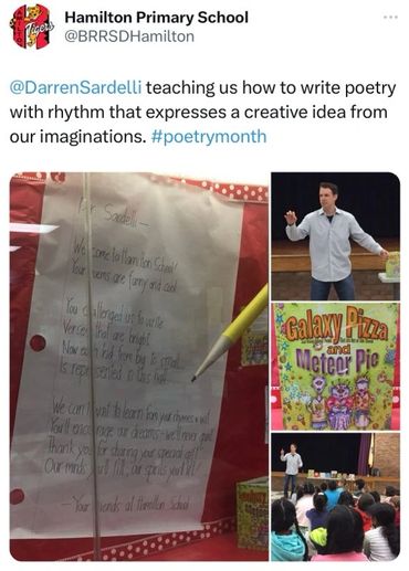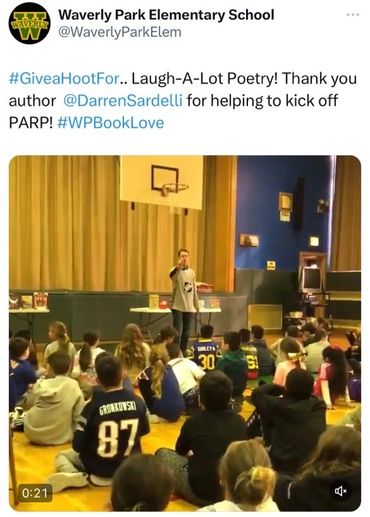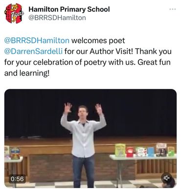 "Hi Darren. You were great today! The students loved listening to your poems and stories. Thank you so much for making our students and staff smile! It is much needed these days. How amazing it was to have our full VIRTUAL and in person students be "together" again. Even though they were not in front of you, they were so engaged and enthusiastic. Thank you!"